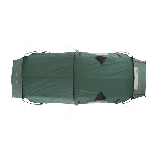 In der Apsis ist Platz für Ausrüstung oder einen kleinen Tisch mit Stühlen. Bei schönem Wetter lassen sich alle drei Eingänge aufrollen oder mit den im Lieferumfang enthaltenen Aufstellstangen aufstellen. Das Aufstellen sorgt nicht nur für besseres Klima und schönen Ausblick, sondern dient gleichzeitig als Sonnenschutz. Jede Tür verfügt über ein eigenes Fenster, das mit Stoff verschlossen werden kann.
