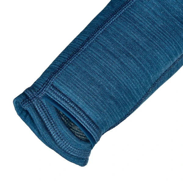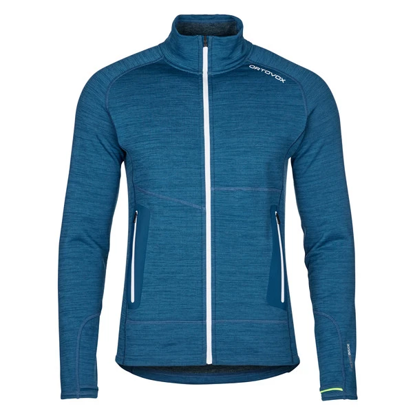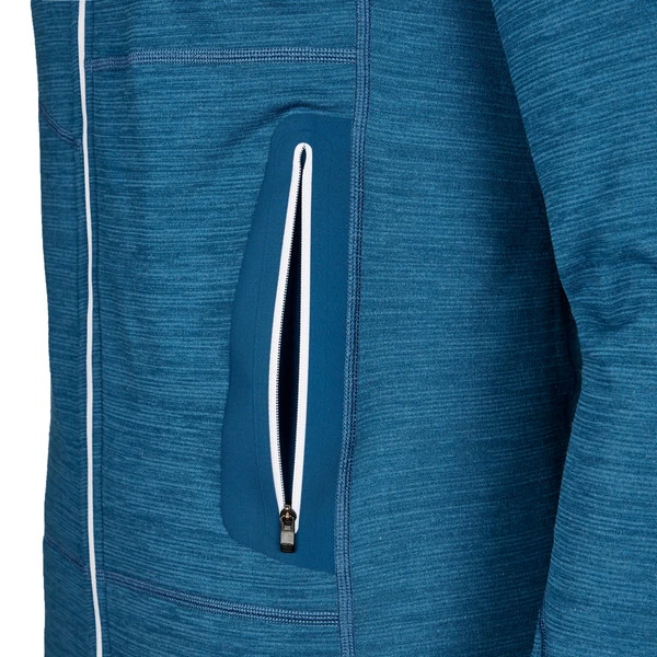 Die Außenseite ist glatt und recht robust, während die leichte Waffelstruktur an der Innenseite für ein gutes Wärme-Gewichtsverhältnis und ein ebenso gutes Feuchtigkeitsmanagement sorgt. Der Merinowoll-Anteil unterstützt den schnellen Abtransport von Körperfeuchtigkeit und steuert seine geruchshemmenden und temperaturregulierenden Eigenschaften bei. So trägt sich die Jacke auch auf langen, schweißtreibenden (Berg-) Touren sehr angenehm. Durch ihren Elasthan-Anteil ist die Jacke stark dehnbar und sorgt so für maximale Bewegungsfreiheit.